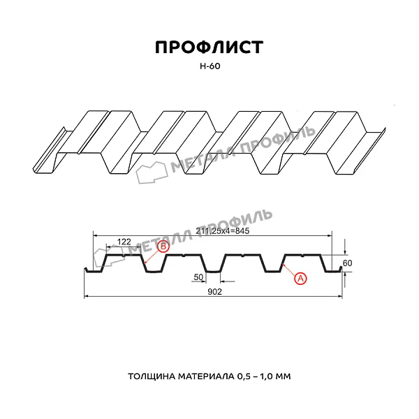 Профлист МЕТАЛЛ ПРОФИЛЬ Н-60x845-A NormanMP (ПЭ-01-5002-0,5) часто используется для монтажа профилированного листа. Изначально он представляет собой стальной оцинкованный лист с покрытием. Общая толщина металла с цинковым и полимерным слоем — 0.5 мм.После проката на специальном оборудовании сталь принимает волнообразный вид. Несущая способность такого листа на порядок выше плоского.