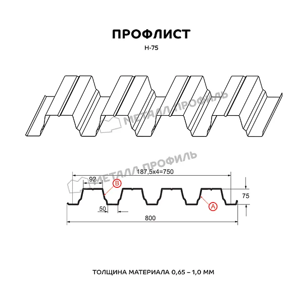 Профлист МЕТАЛЛ ПРОФИЛЬ Н-75x750-A (ПЭ-01-9003-0,8) часто используется для оформления профилированного листа. Изначально он представляет собой металлический оцинкованный лист с покрытием. Толщина металла с оцинковкой и полимерным слоем составляет 0.8 мм. После проката на специальном оборудовании металл принимает волнообразный вид. Несущая способность профилированного листа гораздо выше плоского.
