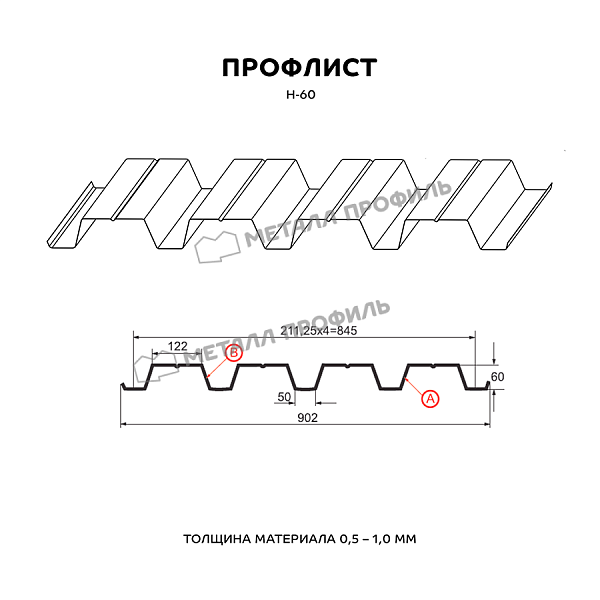 Профлист МЕТАЛЛ ПРОФИЛЬ Н-60х845-A (PURETAN-20-RR23-0,5) часто используется для оформления профилированного листа. Представляет собой металлический оцинкованный лист с покрытием. Общая толщина стальной основы с цинковым и защитно-декоративным покрытием — 0.5 мм. После проката на специальном оборудовании сталь принимает волнообразный вид. Несущая способность профилированного листа на порядок выше плоского.