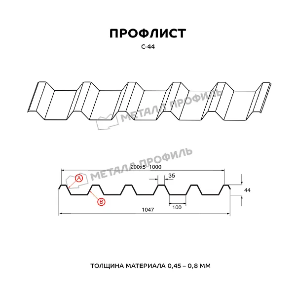 Профлист МЕТАЛЛ ПРОФИЛЬ С-44х1000-A (ПЭ_Д-01-8017-0,45) часто используется для обустройства профилированного листа. Представляет собой лист оцинкованной стали с покрытием. Толщина металла с оцинковкой и полимерным покрытием — 0.45 мм. После проката на специальном оборудовании металл принимает волнообразный вид. Такая конфигурация придает профилю жёсткость.